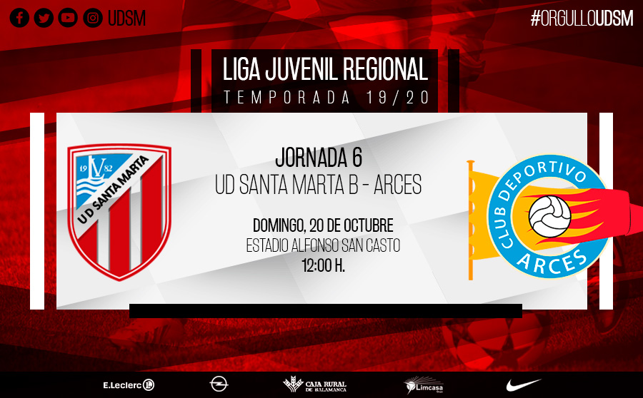 El Juvenil B de la Unión Deportiva Santa Marta disputa la sexta jornada de Liga, este domingo (12:00) en el estadio Alfonso San Casto ante el Arces. Un encuentro que debe servir para ratificar la mejoría del equipo que, desde que cayer en la primera jornada ante la Cultural, ha enlazado un empate y tres victorias, lo que le ha valido para igualar en el primer puesto de la clasificación junto con otros cuatro equipos.