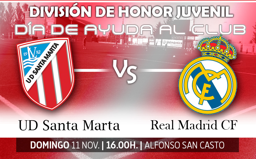 La Unión Deportiva Santa Marta ha declarado día de ayuda al club el partido de la Jornada 11 de División de Honor Juvenil entre nuestro equipo y el Real Madrid CF. El encuentro se disputará en el estadio Alfonso San Casto a las 16:00 horas del próximo domingo, día 11.