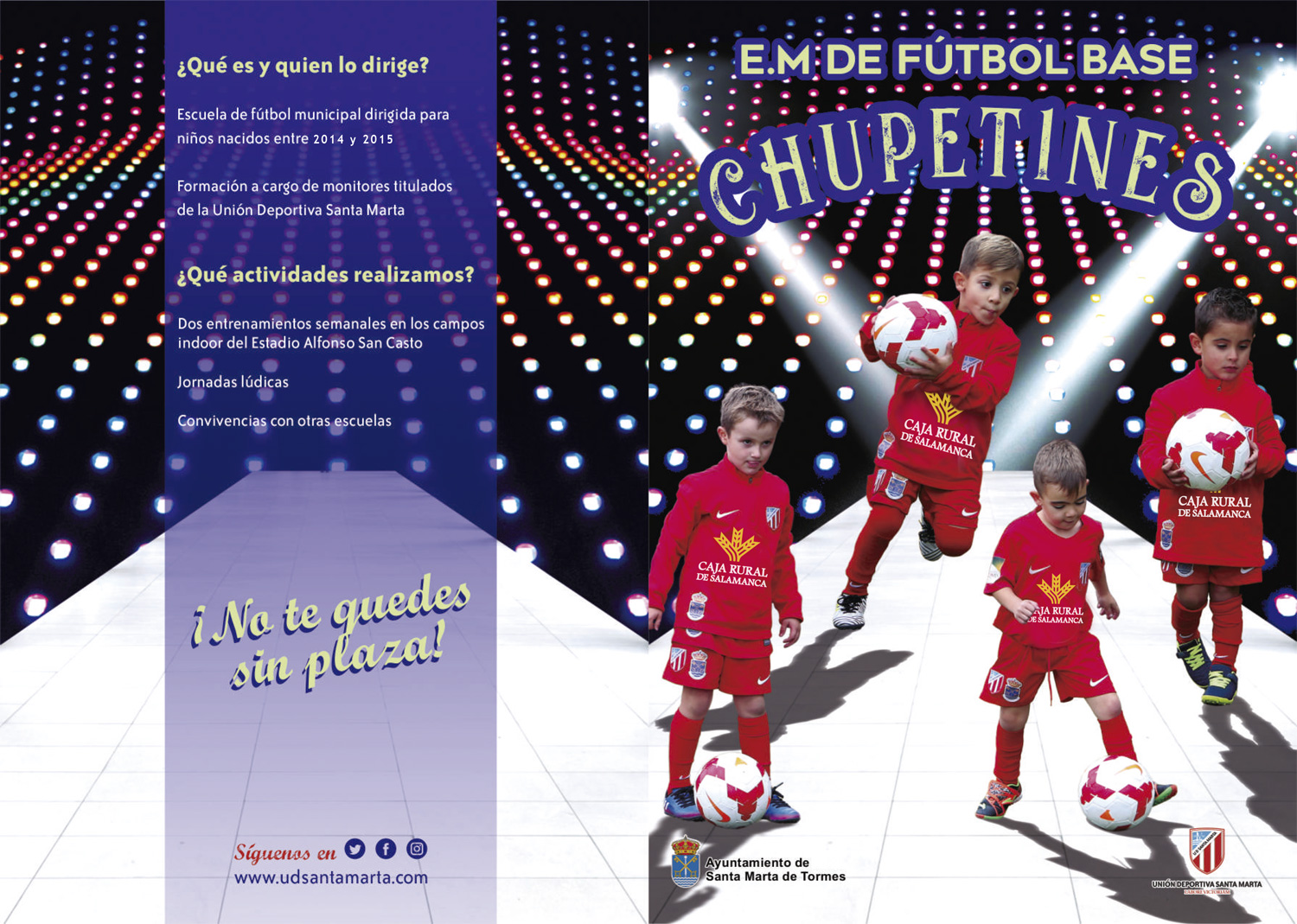 Ya está aquí una temporada más la Escuela Municipal de Fútbol Chupetines de Santa Marta. Los niños de 4 y 5 años que lo deseen podrán pasar a formar parte de esta escuela, antesala al posterior desarrollo en las categorías inferiores de la Academia UDSM. Con los los valores del deporte y al aprendizaje de la técnica y táctica del fútbol con formación a cargo de monitores titulados de la Unión Deportiva Santa Marta.